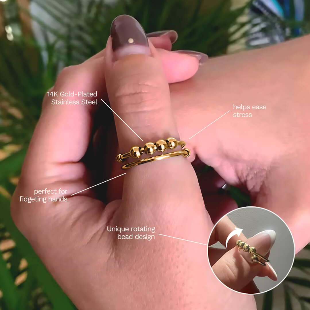 Elevate your accessory game with the Blair Spinner Ring — a striking fusion of bold aesthetics and mindful movement. Featuring a wider, subtly hammered band surrounding a delicate spinning inner band, this ring brings sculptural flair and soothing tactile detail to your look. Crafted from high-quality stainless steel with an optional luxurious 14k gold plating, it offers long-lasting shine and comfort. The contrast between the textured outer layer and the smooth spinner creates a captivating piece that complements both day-to-day and elevated outfits. Thanks to our direct-to-consumer model, you can enjoy this artisan-inspired design at a remarkable value. Make the Blair Spinner Ring yours today and set a stylish, calming highlight for every outfit.